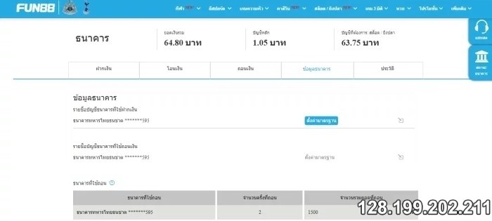 เมื่อคุณเลือกวิธีการถอนเงินผ่านการโอนเงินทางธนาคาร Fun88 จะขอให้คุณระบุข้อมูลบัญชีธนาคาร ซึ่งอาจเป็นบัญชีธนาคารส่วนตัวของคุณ และให้แน่ใจว่าคุณใช้ธนาคารที่รองรับการทำธุรกรรมออนไลน์ในประเทศไทย เช่น ธนาคารกรุงเทพ ธนาคารกรุงไทย หรือ SCB